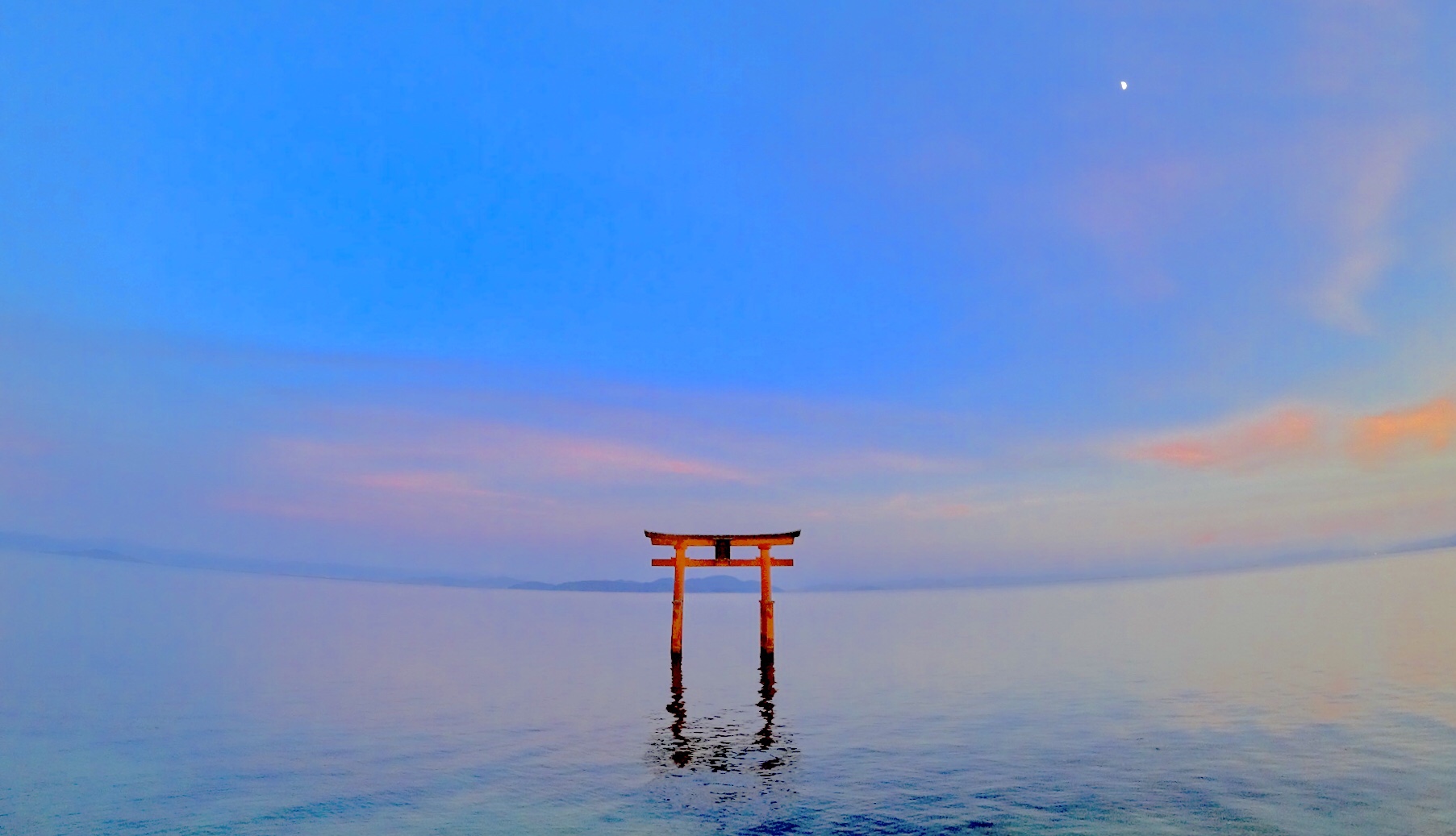 琵琶湖の中にポツンとある鳥居が有名で、多くの方が夕陽をバックに写真を撮ろうと待っていました。